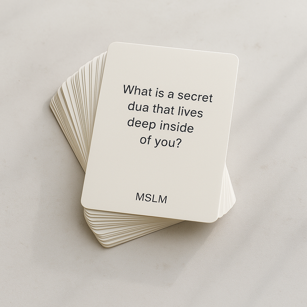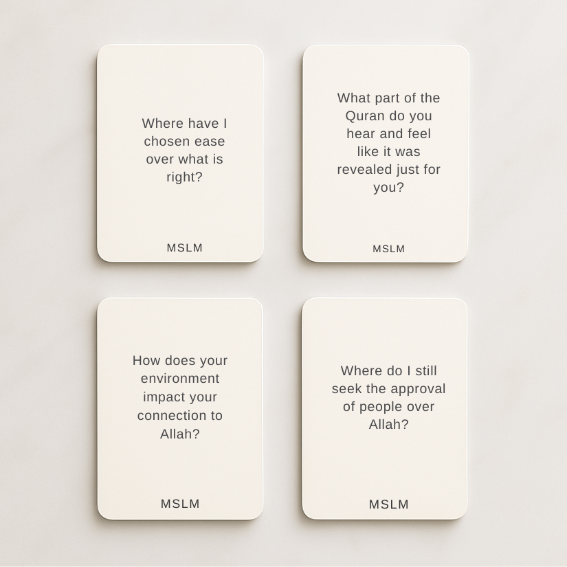 Whether used alone for spiritual self-work, shared in gatherings to inspire conversation and remembrance, or brought into sacred spaces for reflection upon the Qur'an and Sunnah — each card offers a quiet moment of grounding and guidance toward purpose.
